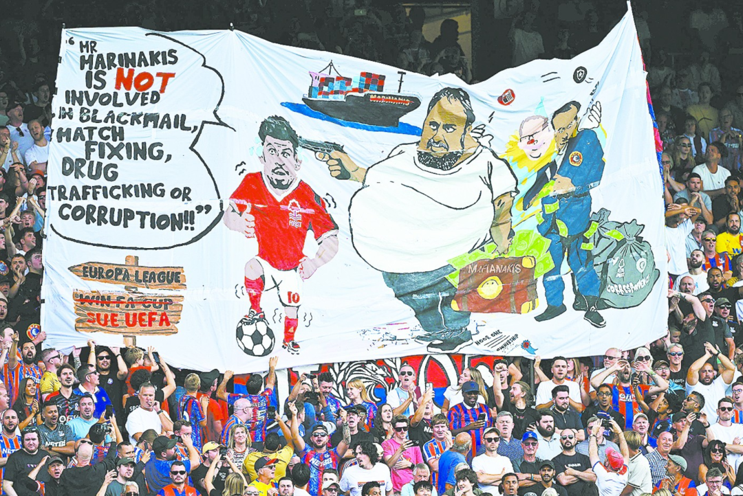 “比赛的焦点被一条横幅所取代。”英国广播公司(BBC)25日称,24日英超联赛水晶宫对阵诺丁汉森林的比赛中,水晶宫球迷展示出一条横幅(如图),画面中描绘了诺丁汉森林老板马里纳基斯用枪指着该队球员吉布斯·怀特的头。怀特身旁的气泡型对话框里有这样一段话:“马里纳基斯先生没有参与敲诈、假球、贩毒或腐败!”